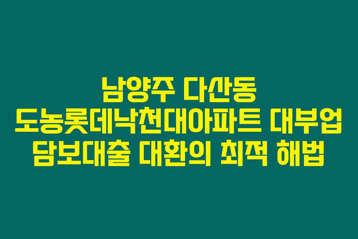 제가 직접 경험해본 결과로는, 남양주 다산동 도농롯데낙천대아파트와 같은 아파트에서 대부업의 담보대출 대환은 매우 중요한 과정입니다. 집값이 상승하면서 대출의 고금리 문제로 어려움을 겪고 있는 분들이 많고, 이를 해결할 수 있는 방법을 알아보는 것이 필요합니다. 아래를 읽어보시면, 대부업 담보대출의 대환 과정과 이점에 대한 정보를 detal히 확인할 수 있습니다.