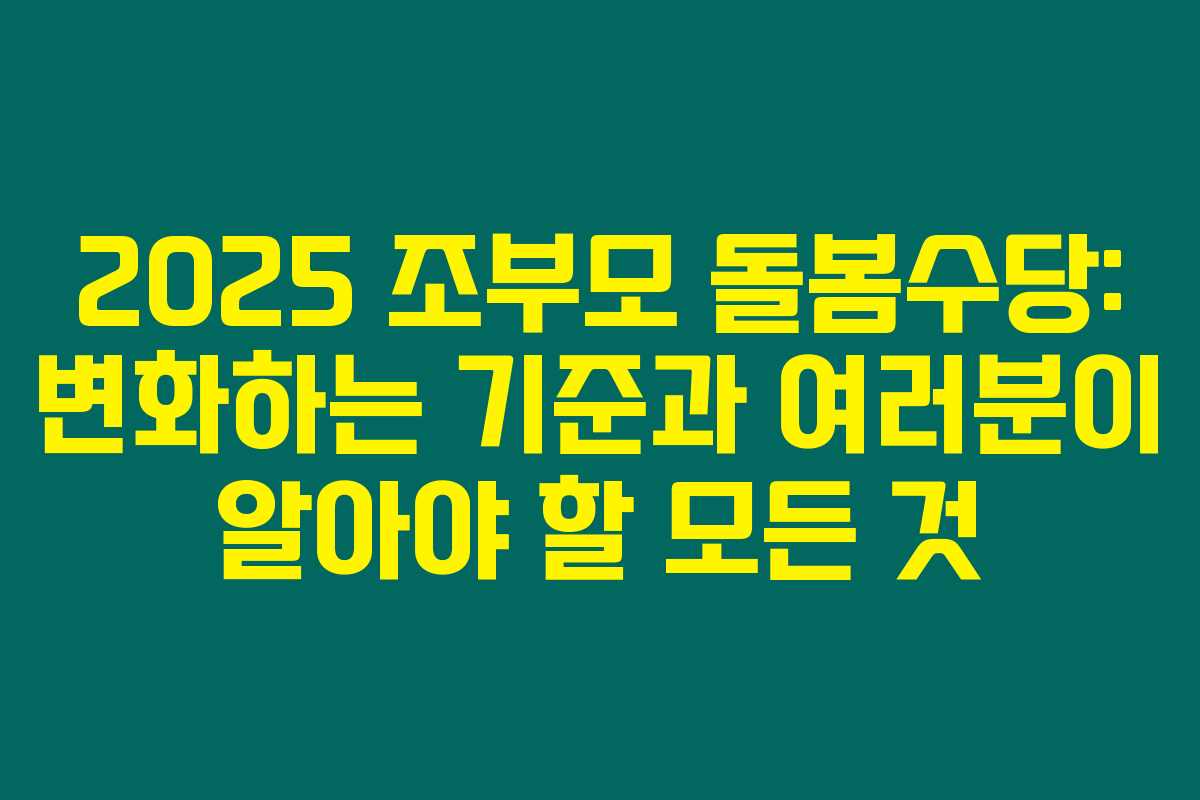 제가 알아본 바로는 2025년부터 조부모 돌봄수당의 신청 조건이 크게 완화되어 중위소득 150% 이하 가구 모두가 혜택을 받을 수 있게 되었습니다. 이는 이전의 다자녀 가구 제한에서 벗어나 모든 가구가 수당을 받을 수 있는 기회를 가질 수 있게 되었다는 뜻이에요. 아래를 읽어보시면 이 변화에 대한 자세한 내용과 신청 방법 등을 쉽게 이해하실 수 있을 것입니다.
